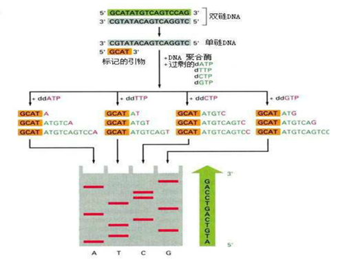 DNA聚合酶催化的DNA链延伸是在3’-OH末端上进行的。由于2’,3’-双脱氧三磷酸核苷酸(ddNTP)的3’-位脱氧而失去游离-OH,当它掺入到DNA链后,3’-OH末端消失,使DNA链的延伸终止。