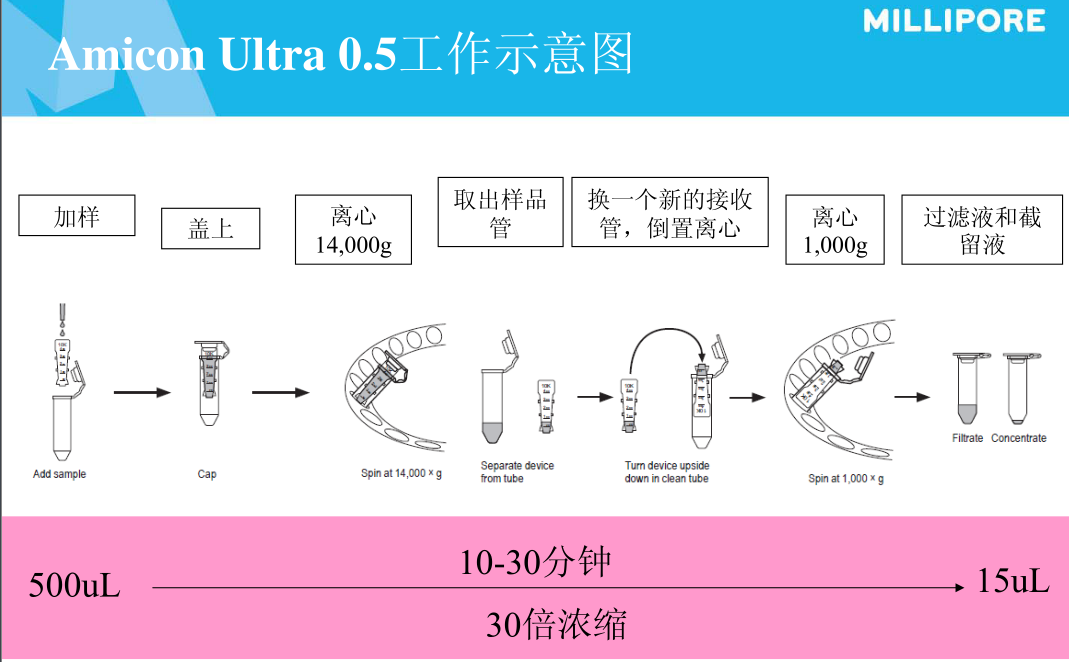 millipore: Amicon Ultra-0.5 0.5mL(处理量) 15µL (最小浓缩体积)5µL (死体积) 2.2mL转子
