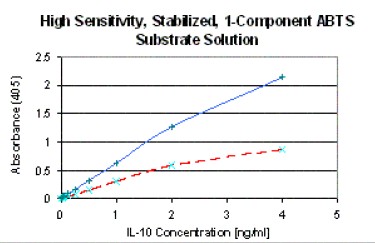 Unlike other ABTS solutions, Super AquaBlue ELISA Substrate is highly sensitive, extremely stable (18 months at room temperature or 24 months at 4°C). It is engineered for convenience as a single component (no additional H2O2 or other components are necessary).