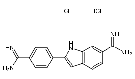 4',6-Diamidino-2-phenylindole Dihydrochloride is a cell permeable fluorescent minor groove-binding probe for DNA. It binds to double-stranded DNA by forming a stablecomplex which fluoresce. DAPI selectively forms complexes with A-T, A-U and I-C base pairs (preferably A-T rich DNA), having one molecule of dye for every 3 base-pairs. DAPI in aqueous solution has two absorbance maxima, at 349 nm and at 263 nm. It can be used as a vital dye to stain nuclei in mature living pollen grains in conjuction with fluroescein diacetate.