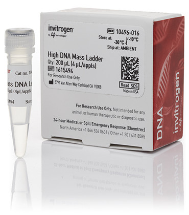 High DNA Mass Ladder is suitable for estimating the mass (quantity) of unknown DNA samples by ethidium bromide staining. This ladder consists of an equimolar mixture of six blunt-ended DNA fragments of 10, 6, 4, 3, 2, and 1 kb. Electrophoresis of 4 µl of the High DNA Mass Ladder results in bands containing 200, 120, 80, 60, 40, and 20 ng (520 ng total) of DNA, respectively.