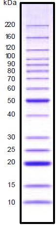 The BenchMark™ Protein Ladder is suitable as a molecular weight standard for SDS-PAGE (1). It consists of 15 recombinant proteins ranging in molecular weight from 10 to 220 kDa and can be used with NuPAGE®, Tris-Glycine, or Tricine Gels. The BenchMark™ Protein Ladder offers: