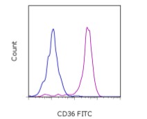 Description: The monoclonal antibody eBioNL07 recognizes human CD36, which is a member of the class B scavenger receptor family. CD36 was originally identified as a platelet-membrane glycoprotein also called glycoprotein IV and a receptor for thrombospondin-1 (TSP-1) and extracellular matrix proteins. Binding to TSP-1 is in the CLESH (CD36 LIMP-II Emp sequence homology) domain of CD36. CD36 expression is broad and includes microvascular (but not large vessel) endothelium, adipocytes, skeletal muscle, dendritic cells, epithelia of the retina, breast, and intestine, smooth muscle cells, and hematopoietic cells, including erythroid precursors, platelets, monocytes/macrophages, DCs and megakaryocytes. Expression on platelets is absent on Nak-a negative donors. Unlike other scavenger receptor, CD36 binds LDL that has been exposed to “minimally” oxidizing conditions. CD36 is also a fatty acid translocase (FAT) necessary for the transport of long-chain fatty acids (LCFAs) and therefore may play a role in atherosclerosis.