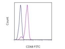 Description: The eBioY1/82 antibody reacts with CD68 which belongs to the sialomucin family and is closely related to the family of lysosomal-associated membrane proteins (lamps) and scavenger receptor. CD68 is predominantly an intracellular protein, found mainly in the late endosomal compartment but can be detected in smaller amounts on the surface of cells of mainly myeloid derived cells; monocytes and macrophages, dendritic cells (and in some langerhan cells), neutrophils, basophils mast cells, myeloid progenitor cells, and a subset of CD34+ hemopoietic bone marrow progenitor cells. The function has not been fully elucidated but based on it's homolgy and structure suggests a role in antigen processing or presentation and protection of the lysosomal membrane from hydrolytic enzymes. Reports have also seen expression in activated T cells, and about 40% of peripheral blood B-lymphocytes and 50% of all B-ALL.