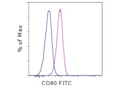 Description: The 2D10.4 monoclonal antibody reacts with human CD80 (B7-1), a 60 kDa member of the Ig superfamily. CD80 is expressed by activated B cells, macrophages and dendritic cells. In addition, activated T cells express this antigen. CD80 has high affinity for binding to two T cell surface antigens, CD28 and CD152 (CTLA-4). The interaction of CD28 and CD152 with CD80 is crucial in T-B cell communication leading to activation of T and B cells, respectively.