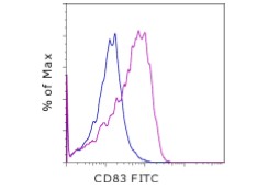 Description: The Michel-17 monoclonal antibody reacts with mouse CD83, a 45kDa cell surface glycoprotein and a member of the Ig superfamily. The mouse CD83 antigen is expressed predominantly on mature DC and activated lymphocytes. Cross-linking of CD83 with Michel-17 on DC or activated T cells does not induce any activation signal. CD83 plays an important role in T cell development through interaction with its ligand. CD83-Ig protein has revealed the presence of a CD83 ligand expressed mainly by B220+ cells in mouse spleen.