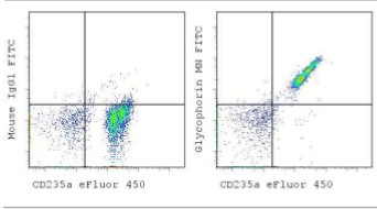 Description: The monoclonal antibody 10F7MN recognizes human glycophorin A (also known as CD235a). The antibody can see both the M and N alleles. Glycophorin A is a 151 amino acid sialoglycoprotein found on the erythrocyte (RBC) and erthyroid progenitor cell membrane at about 500,000 copies per cell. The gene for glycophorin resides on chromosome 4 and has 2 allelic forms: M and N, which differ in two amino acids. The M group possesses Ser1 and Gly5 while the N group has Leu1 and Glu5. Recent data suggest that exposure to toxins can cause mutation or loss of an allele resulting in phenotypic changes. Studies are also beginning to correlate genotype/phenotype with predisposition to cancer and heart disease.