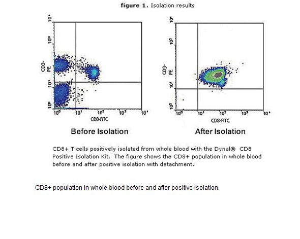 The Dynabeads® CD8 Positive Isolation Kit supplies superparamagnetic beads that enable gentle isolation of pure CD8+ T cells from whole blood, bone marrow, buffy coat, mononuclear cells (MNC), or tissue digests. The cells are released from the beads using the DETACHaBEAD® reagent to obtain bead- and antibody-free cells. Advantages of the Dynabeads® CD8 Positive Isolation Kit: