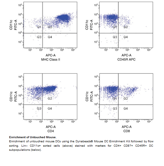 Use this kit to enrich viable mouse dendritic cells (DC’s) from spleen/lymph node cells by negative isolation. The kit depletes T cells, mIgM+ B cells, NK cells, erythrocytes and most granulocytes. Highly enriched mouse DC’s are bead and antibody-free, and can be used in any functional assay. The cells can be further sorted to obtain high purity of specific DC sub-populations.