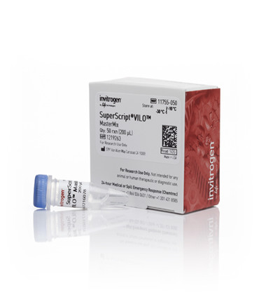 The SuperScript® VILO™ Master Mix provides the high-temperature capability of SuperScript® III Reverse Transcriptase in an optimized format. The SuperScript® VILO™ Master Mix can generate first-strand cDNA for use in real-time quantitative RT-PCR (qRT-PCR) with very low and very high amounts of input RNA (up to 2.5 µg total RNA in a 20 µL reaction).