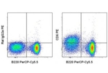 Description: The monoclonal antibody IM348 recognizes mouse CD6, a transmembrane glycoprotein of the scavenger receptor family. The extracellular domain contains three scavenger receptor cysteine rich (SRCR) domains, a transmembrane region and a cytoplasmic domain of variable length depending on the isoform. CD6 is expressed on most T lymphocytes. Expression between human and mouse is slightly different. In mice B cells in the spleen do not have CD6, while humans express it on a subset of B lymphocytes. The CD6 ligand is CD166, also known as Activated Leukocyte Cell Adhesion Molecule (ALCAM). Through interactions with CD166 or homotypic CD6-CD6, a role exists in adhesion and migration during organogenesis. The intracellular domain of CD6 is constitutively phosphorylated, suggesting a role in T cell activation and signaling. In humans depletion of CD6-expressing cells increases graft versus host tolerance in transplants.
