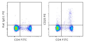Description: The PC61.5 antibody reacts with mouse CD25, the 55 kDa interleukin-2 receptor alpha chain (IL-2R alpha). CD25 is expressed by early progenitors of the T and B lineage as well as by activated mature T and B lymphocytes. By itself, CD25 binds IL-2 only with low affinity. However, CD25 associates with CD122 (IL-2 receptor beta chain) and CD132 (common gamma chain) to form the high affinity IL-2 receptor. Binding of IL-2 to both the high and low affinity classes of IL-2 receptor is inhibited by the PC61.5 antibody. CD25 plays a role in lymphocyte differentiation and activation/proliferation.