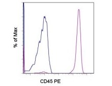 Description: The HI30 monoclonal antibody reacts with all isoforms of human CD45, also known as Leukocyte Common Antigen (LCA). CD45 is expressed by all hematopoietic cells excluding circulating erythrocytes and platelets. The cytoplasmic portion of CD45 has tyrosine phosphatase enzymatic activity and plays an important role in activation of lymphocytes.