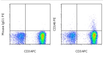 Description: The monoclonal antibody P1H12 recognizes CD146 also known as MUC18, s-endo, Endo-CAM and Mel-CAM, which is a member of the Ig superfamily of proteins. The expression of CD146 is found on endothelial cells, bone marrow fibroblasts and some tumors (especially melanoma). Recently mesenchymal stromal cells and endometrial stromal cells have also been shown to express CD146. The presence of CD146 on circulating blood cells have been confined to a subset of T cells rather than circulating endothelial cells, as expression of other endothelial markers (CD31 and CD51/61) is negative. Expression can be found on activated lymphocytes. The protein is heavily glycosylated with more than 50% of the mass from carbohydrates.