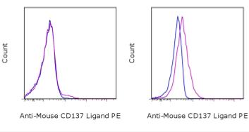 Description: The TKS-1 monoclonal antibody reacts with mouse 4-1BB Ligand (4-1BBL), a type II transmembrane protein and a member of the tumor necrosis factor superfamily. 4-1BBL is expressed by activated antigen presenting cells including B cells and macrophages. Interaction of 4-1BBL with 4-1BB (CDw137) is reported to deliver a costimulatory signal important in the T-APC interaction.