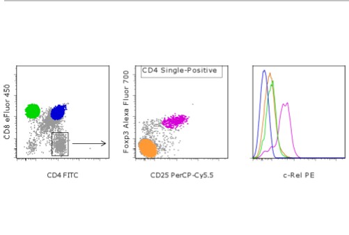 Description: The 1RELAH5 monoclonal antibody reacts with mouse c-Rel. c-Rel is a 65 kDa hematopoietic lineage-restricted member of the NF-kB family of transcription factors. In the thymus, c-Rel is upregulated in regulatory T cells (Treg) when compared to other CD4+ thymocytes. c-Rel is believed to play a critical role in thymic Treg (nTreg) development, but is not necessary for TGF beta-mediated T reg (iTreg) differentiation. C-Rel is also involved in proliferation and survival in mature T cells.