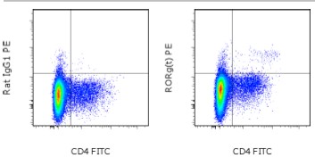 Description: The B2D monoclonal antibody reacts with the mouse ROR gamma (t) protein. ROR gamma is a member of the retinoic acid-related orphan receptor (ROR) family, which also includes ROR alpha and ROR beta. ROR family proteins are ligand-dependent transcription factors that play roles in multiple physiological processes. ROR gamma is expressed in several tissues including liver, lung, muscle, heart and kidney. Furthermore, it was discovered that alternative transcription results in the expression of an isoform, ROR gamma t, which is expressed exclusively in cells of the lymphoid compartment, namely CD4+CD8+ “double-positive” thymoyctes, Th17 cells of the periphery and lymphoid tissue inducer (Lti) cells of lymphoid organs.