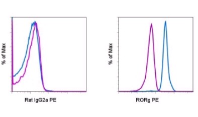 Description: The AFKJS-9 monoclonal antibody reacts with the mouse RORγ(t) protein. RORγ is a member of the retinoic acid-related orphan receptor (ROR) family, which also includes RORα and RORβ. ROR family proteins are ligand-dependent transcription factors that play roles in multiple physiological processes. RORγ is expressed in several tissues including liver, lung, muscle, heart and kidney. Furthermore, it was discovered that alternative transcription results in the expression of an isoform, RORγt, which is expressed exclusively in cells of the lymphoid compartment, namely CD4+CD8+ “double-positive” thymoyctes, Th17 cells of the periphery and lymphoid tissue inducer (Lti) cells of lymphoid organs.