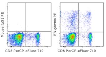 Description: The 4S.B3 monoclonal antibody reacts with interferon gamma (IFN gamma). The 4S.B3 antibody is a neutralizing antibody. Human IFN gamma is a 17 kDa factor produced by activated T and NK cells and is an anti-viral and anti-parasitic cytokine. IFN-γ in synergy with other cytokines, such as TNF alpha, inhibits proliferation of normal and transformed cells. Immunomodulatory effects of IFN gamma are exerted on a wide range of cell types expressing the high affinity receptors for IFN gamma. Glycosylation of IFN gamma does not affect its biological activity.