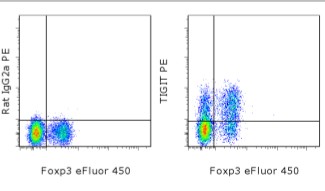 Description: The GIGD7 monoclonal antibody reacts with mouse T cell immunoreceptor with Ig and ITIM domains (TIGIT, VSTM3, WUCAM), a 26 kDa protein that is a member of the poliovirus receptor (PVR) family. In mice, the expression of TIGIT has been reported in follicular T helper cells, while in humans, the expression of TIGIT has been reported on NK cells, regulatory T cells, follicular T helper cells, memory CD4+ T cells, and CD8+ T cells. TIGIT is not expressed on B cells or naïve CD4+ T cells. TIGIT is upregulated on CD4+ T cells following activation. TIGIT can interact with certain members of the PVR and PVR-like families, including CD155, and also mediates the interaction of NK cells and T cells with antigen presenting cells, fibroblasts and endothelial cells that express PVR and PVR-like proteins.