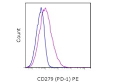 Description: The J43 monoclonal antibody reacts with mouse PD-1 (programmed death-1), a 55 kDa member of the Ig superfamily. PD-1 contains the immunoreceptor tyrosine-based inhibitory motif (ITIM) and plays a key role in peripheral tolerance and autoimmune disease in mice. PD-1 is expressed mainly on activated T and B lymphocytes. Two novel B7 Family members have been identified as PD-1 ligands, PD-L1 (B7-H1) and PD-L2 (B7-DC). Evidence reported to date suggests overlapping functions for these ligands and their constitutive expression on some normal tissues and upregulation on activated antigen-presenting cells. It is reported that J43 inhibits the binding of mouse PD-L1-Ig and mouse PD-L2-Ig to PD-1/BHK transfected cells. When administrated in vivo, both intact and Fab of J43 are reported to enhance contact hypersensitivity and exacerbate acute GVHD similar to transfer of PD-1-deficient cells. Injection of J43 also exacerbates EAE and NOD diabetes as do specific antibodies to mouse PD-L1 and PD-L2.