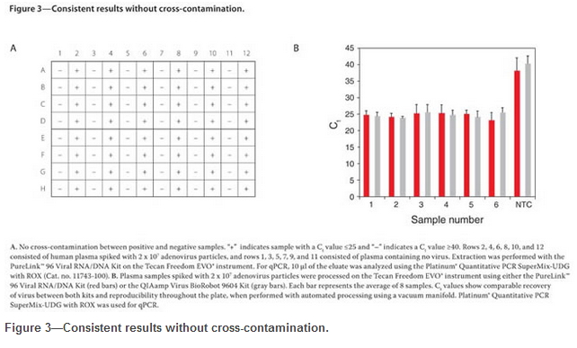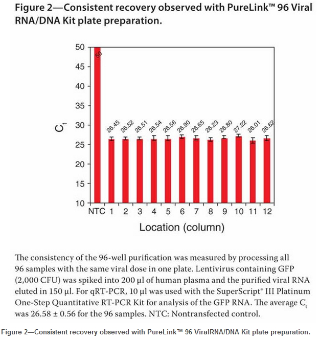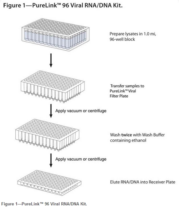 The PureLink™ 96 Viral RNA/DNA Kit is a 96-well silica plate system that can extract both viral RNA and DNA from 200-µl cell-free fluids which uses a low-depth 96-well centrifuge bucket for ease-of- use, all without any loss in sensitivity. These kits provide flexibility in centrifuge choice. Minimum speeds for 96 well processing of 2250 x g and a rotor bucket depth of 5 cm make this kit one of the most adaptable systems for existing laboratory centrifuges