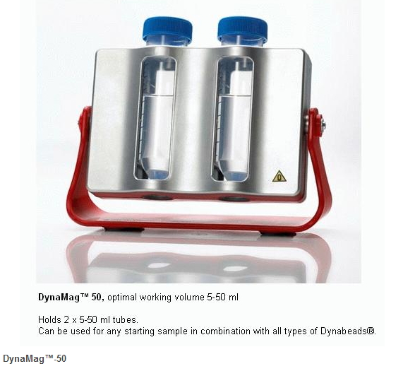 The new DynaMag™-50 magnet is optimized for efficient cell isolation using Dynabeads®. The DynaMag™-50 magnet combines a strong magnetic attraction for efficient separations with a flexible and smart ergonomic design that ensures a comfortable working position. A tilting mechanism on the magnet enables you to rest your elbows while pipetting. The magnet can be used for any starting sample in combination with all types of cell-isolation Dynabeads®.