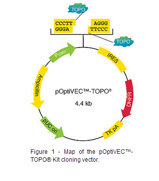 OptiCHO™ Express 试剂盒设计用于悬浮培养物中二氢叶酸还原酶缺陷型 (DHFR-) 中国仓鼠卵巢 (CHO) DG44 细胞的高效生长和转染。 该试剂盒为在无血清环境中高效转染 DHFR- DG44 细胞以及随后开发稳定的细胞系提供完整的实验流程以及所需的试剂,包括: • pOptiVEC™-TOPO® 载体 - 双顺反子克隆载体,包含在 CHO-DG44 细胞中开发稳定细胞系所需的 DHFR 基因(图 1);载体与 TOPO® 兼容,能够以 >85% 的效率克隆包含目的基因的 PCR 产物 • FreeStyle™ MAX 转染试剂 - 无动物来源成分的转染试剂,可提供较高的转染效率和一致的结果 • CD OptiCHO™ 培养基 - 化学成分确定的无蛋白质培养基(不含次黄嘌呤或胸苷),设计用于重组 CHO-DG44 细胞的高密度悬浮培养和分泌蛋白的生产 • CD DG44 培养基 - 化学成分确定的无蛋白质培养基,添加次黄嘌呤和胸苷,支持 DG44 细胞在悬浮培养中的最优生长 •DG44 细胞 - 针对 CD DG44 培养基预先进行过驯化,并经过筛选以进行高效的细胞生长和转染 此外,OptiCHO™ Express 试剂盒提供 GIBCO® OptiPRO™ SFM 以促进 DNA-脂质体复合物的形成,提供 L-谷氨酰胺(单独提供,以增加培养基的稳定性)和 Pluronic® F-68 以控制悬浮培养物中的剪切力。 本试剂盒是克隆用于上述系统的工具: