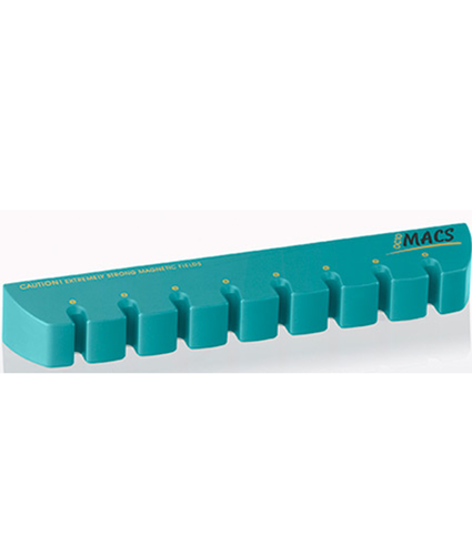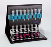 The MACS Separation system is developed to separate human and animal cells. Moreover it can be used for the separation of plant protoplasts, bacteria, cell organelles, and other bioparticles. The material to be separated, for example, cells, is first magnetically labeled with superparamagnetic MACS MicroBeads. After magnetic labeling, cells are passed through a MACS Column which is placed in the strong permanent magnet of the MACS Separator. The ferromagnetic spheres in the column amplify the magnetic field by 10,000-fold, thus inducing a high gradient. Unlabeled cells pass through while magnetically labeled cell are retained within the column. After removal of the column from the magnetic field, the retained fraction can be eluted. Both fractions, labeled and non-labeled, are completely recovered.