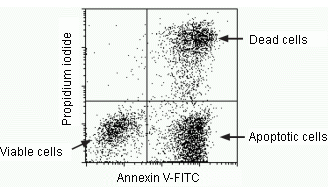 In most normal, viable eukaryotic cells, the negatively charged phospholipid phosphatidylserine (PS) is located in the cytosolic leaflet of the plasma membrane lipid bilayer.¹ PS redistribution from the inner to the outer leaflet is an early and widespread event during apoptosis.¹,² However, in necrosis, PS becomes accessible due to the disruption of membrane integrity.² Apart from necrosis and apoptosis, PS also becomes accessible in activated platelets³, in certain cell anomalies like sickle cell anemia⁴, in erythrocyte senescence⁵, upon degranulation of mast cells⁶ and in certain stages of B cell differentiation⁷. PS exposure also serves as a trigger for the recognition and removal of apoptotic cells by macrophages.⁸,⁹ Annexin V is a 35 kDa phospholipid-binding protein and a major cell membrane component of macrophages and other phagocytic cell types. Annexin V has a high affinity to PS in the presence of physiological concentrations of calcium (Ca²+).¹⁰