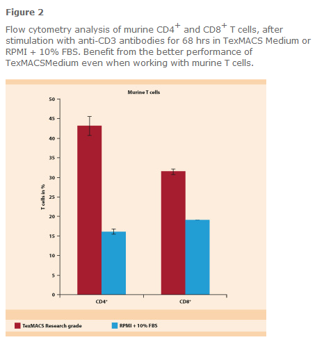 TexMACS Medium, research grade is an optimized serum-free cell culture medium developed for the cultivation and expansion of human and mouse T cells and regulatory T cells. This complete medium is chemically defined enabling reproducible application in human and mouse cell culture. It is manufactured without animal-derived components.