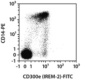 The monoclonal antibody UP-H2 reacts with human CD300e, also known as IREM-2, LMIR6, or CMRF35-A5. This 34 kDa activating receptor of the immunglobulin superfamily is expressed on mature myeloid dendritic cells and monocytes and is down-regulated on immature dendritic cells. CD300e interacts with DAP-12, which mediates acivating signals. It is reported that the alloreactive response of naive T cells is enhanced by IREM-2 activation of mDCs.