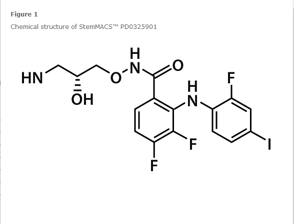StemMACS™ PD0325901 is a selective small molecule inhibitor of MEK (mitogen-activated protein kinase, MAPK/ERK kinase), a key component of the Ras/Raf/MEK/ERK signaling pathway.