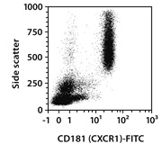 Clone 8F1 recognizes the human CD181 antigen, a multi-pass membrane protein also known as C-X-C chemokine receptor type 1 (CXCR1) or IL-8 receptor A (IL-8RA). CD181 is expressed as homodimer or heterodimer with CD182 (CXCR2) and found on granulocytes, NK cells, a subset of T lymphocytes, mast cells, monocytes, endothelial cells, megakarocytes, and oligodendrocytes. It is one of two high-affinity receptors for IL-8, a major mediator of immune and inflammatory responses implicated in many disorders, including tumor growth. IL-8, released in response to inflammatory stimuli, binds to the extracellular part of CD181. The ligand-activated intracellular signaling pathways results in neutrophil migration to the site of inflammation.