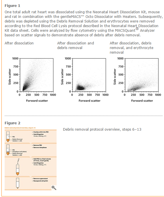 The Debris Removal Solution is a ready-to-use density gradient reagent. It allows for the fast and effective removal of cell debris from viable cells after dissociation of various tissue types while applying full acceleration and full brake during centrifugation.Cell debris often occurs after tissue dissociation and impairs downstream applications. The Debris Removal Solution allows for the fast and effective removal of cell debris after tissue dissociation for high quality downstream applications, including cell separation, flow analysis, and cell culture. It has been particularly tested for debris removal from dissociated rat and mouse heart tissue and human and mouse tumor tissue.
