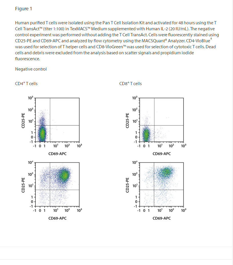 T Cell TransAct™ has been developed as a ready-to-use reagent to activate and expand human T cells via CD3 and CD28. Its polymeric nanomatrix structure ensures gentle and efficient activation of resting T cells from PBMCs and of enriched T cell populations, while maintaining high viability.