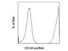 Description: The monoclonal antibody P1H12 recognizes CD146 also known as MUC18, s-endo, Endo-CAM and Mel-CAM, which is a member of the Ig superfamily of proteins. The expression of CD146 is found on endothelial cells, bone marrow fibroblasts and some tumors (especially melanoma). Recently mesenchymal stromal cells and endometrial stromal cells have also been shown to express CD146. The presence of CD146 on circulating blood cells have been confined to a subset of T cells rather than circulating endothelial cells, as expression of other endothelial markers (CD31 and CD51/61) is negative. Expression can be found on activated lymphocytes. The protein is heavily glycosylated with more than 50% of the mass from carbohydrates.