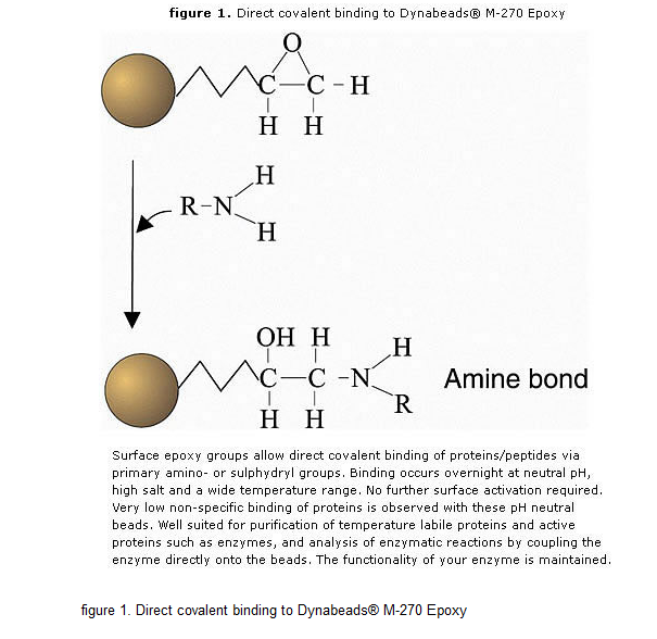 Upon completion of the ligand coupling step, the reactive moieties on the Dynabeads® M-270 Epoxy beads are deactivated to prevent further coupling. Once the coupling reaction is completed, these nonporous, hydrophilic, pH neutral beads exhibit extremely low nonspecific binding.