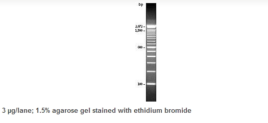 100 bp 的 DNA Ladder 适合测量 100 至 1500 bp 双链 DNA 的大小。 由包含重复的 100 bp DNA 片段的质粒制备,ladder 由 15 个平末端片段组成,这些片段的长度范围是 100 至 1500 bp,增幅为 100 bp,另外还包含一个 2072 bp 的片段。 用溴化乙啶染色后,可以在 1% 至 2% 的琼脂糖凝胶上观察双链 ladder。 为了便于在琼脂糖凝胶上提供参照,600 bp 条带比梯度中的其它条带亮两至三倍。 该 Ladder 可以用溴化乙啶染色,或者使用 T4 多核苷酸激酶或 T4 DNA 聚合酶进行放射标记。