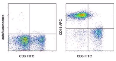 Description: The eBio1D3 monoclonal antibody reacts with mouse CD19, a 95 kDa transmembrane glycoprotein. CD19 is expressed by B cells during all stages of development excluding the terminally differentiated plasma cells. Follicular dendritic cells also express CD19. Together CD21, CD81, MHC class II, and CD19 form a multimolecular complex that associates with the BCR. Signaling through CD19 induces tyrosine phosphorylation, calcium flux and proliferation of B cells.