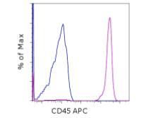 Description: The HI30 monoclonal antibody reacts with all isoforms of human CD45, also known as Leukocyte Common Antigen (LCA). CD45 is expressed by all hematopoietic cells excluding circulating erythrocytes and platelets. The cytoplasmic portion of CD45 has tyrosine phosphatase enzymatic activity and plays an important role in activation of lymphocytes.