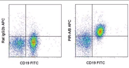 Description: This 10-1-PIR monoclonal antibody reacts with mouse paired Ig-like receptors of activating (PIR)-A and -B. These cell surface glycoproteins, which contain six extracellular Ig-like domains with distinct transmembrane and cytoplasmic regions, are expressed together on B lymphocytes, dendritic cells, macrophages, granulocytes, platelets, and mast cells. However, expression of PIR-A/B has not been observed on T cells, NK cells, and erythrocytes. The PIR-A receptor interacts with signaling molecules containing immunoreceptor tyrosine-based activation motifs (ITAMs) which lead to its activating function. In contrast, the PIR-B receptor associates with proteins possessing immunoreceptor tyrosine-based inhibitory motifs (ITIMs); therefore, this receptor has been shown to have an inhibitory function. PIRs bind MHC class I to modulate cell signaling and homeostasis of the immune system. Moreover, PIR-B knockout mice have been shown to exhibit susceptibility to Salmonella infection.