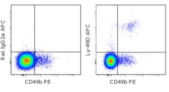 Description: The monoclonal antibody eBio4E5 (4E5) reacts with Ly-49D, an activating member of the Ly-49 family of NK cell receptors. This family of receptors form homodimers that recognize MHC Class I molecules. The activating Ly-49 receptors (Ly-49D and Ly-49H) do not contain immune receptor tyrosine-based inhibitory motifs (ITIM) in their cytoplasmic domains, distinguishing them from the inhibitory Ly-49 family members. Instead, activating Ly-49 molecules have been shown to associate with DAP12 which contains an immunoreceptor tyrosine-based activation motif (ITAM) that is required for positive signaling. Expression of different Ly-49 family members is not linked, therefore, several Ly-49 proteins can be expressed on the same cells. Expression of Ly-49D on subsets of NK cells is strain-dependent and is found in C57BL/6, CB6F1 and SJL mice, while BALB/c, DBA/2, AKR and CBA/J mice are negative for Ly-49D. In 129/J mice, eBio4E5 also recognizes Ly-49O, Ly-49V and Ly-49R. eBio4E5 is reported to have functional (activating) activity.