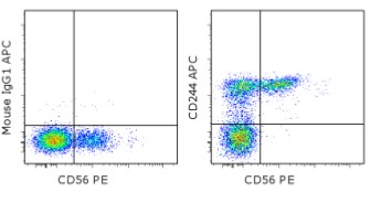 Description: The eBioDM244 monoclonal antibody reacts with human CD244 (2B4, p38). In human, CD244 is a 38 kDa protein expressed on NK cells, a subset of CD8+ T cells, γδ T cells, monocytes, basophils and eosinophils. Binding of the CD244 ligand, CD48, results in NK cell activation, unlike mouse CD244, which is an inhibitory receptor.