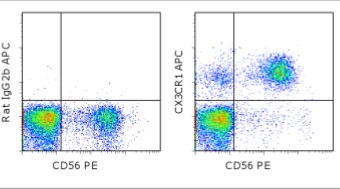 Description: This 2A9-1 monoclonal antibody reacts with human CX3CR1, which is the receptor for fractalkine, a transmembrane chemokine of the CX3C family. CX3CR1 is a seven transmembrane G protein-coupled receptor expressed on CD16+ NK cells, T cells (e.g. CD8+, CD4+, and gamma/delta), and monocytes. In non-immune cells, CX3CR1 has been found on osteoclast precursors and microglia. Little to no CX3CR1 surface expression can be detected on B cells and granulocytes. Together, fractalkine and its receptor mediate cell-cell adhesion and chemotaxis of NK cells, T cells, and monocytes. The expression of CX3CR1 has also been correlated with high levels of intracellular perforin and granzyme B.