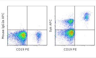 Description: This 4D10.1 monoclonal antibody recognizes human Syk, a 72-kDa member of the Syk/ZAP-70 family of non-receptor protein tyrosine kinases. Syk is expressed most highly in B cells, with lower expression in immature thymocytes, mast cells, and platelets. Syk can also be detected in fibroblasts, epithelial cells, hepatocytes, endothelial cells, and neuronal cells. This protein is a major component of signaling cascades downstream of the B and T cell antigen receptors and plays an essential role in lymphocyte development. Upon recruitment to immunoreceptor tyrosine-based activation motifs (ITAMs) on the antigen receptors, Syk is activated by phosphorylation on multiple tyrosines. Once activated, Syk phosphorylates proteins such as phospholipase C gamma and BLNK/SLP-65. Finally, abnormal Syk expression has been linked to tumor cell migration and invasion in several cancers.