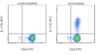 Description: The eBio64DEC17 antibody reacts with human IL-17A. The eBio64DEC17 antibody is a neutralizing antibody. Interleukin-17A (IL-17A) is a CD4+ T cell-derived cytokine that promotes inflammatory responses in cell lines and is elevated in rheumatoid arthritis, asthma, multiple sclerosis, psoriasis, and transplant rejection. The cDNA encoding human IL-17A was isolated from a library of CD4+ T cells; the encoded protein exhibits 72 percent amino acid identity with HVS13 , an open reading frame from a T lymphotropic Herpesvirus saimiri, and 63 percent with mouse CTLA-8 (cytotoxic T-lymphocyte associated antigen-8). Human IL-17A exists as glycosylated 20-30 kD homodimers. High levels of IL-17A homodimer are produced by activated peripheral blood CD4+ T-cells. IL-17A enhances expression of the intracellular adhesion molecule-1 (ICAM-1) in human fibroblasts. Human IL-17A also stimulates epithelial, endothelial, or fibroblastic cells to secrete IL-6, IL-8, G-CSF, and PGE2. In the presence of human IL-17A, fibroblasts can sustain the proliferation of CD34+ hematopoietic progenitors and induce maturation into neutrophils. Mouse, rat, and human IL-17A can induce IL-6 secretion in mouse stromal cells, indicating that all homologs can recognize the mouse IL-17A receptor.
