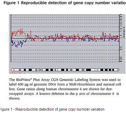 The BioPrime® Plus Array CGH Genomic Labeling Systems are a high-performance labeling kits that enable reproducible labeling of genomic DNA samples for array-based Comparative Genomic Hybridization (CGH). Available in both indirect and direct labeling formats, the BioPrime® Plus Array CGH Genomic Labeling Systems provide a flexible solution to your genomic labeling needs. Using the BioPrime® Plus Array CGH Genomic Labeling Systems, you can expect: ––High yields of fluorescently labeled genomic DNA –signal-to-noise ratios –detection of gene copy number variations (Figure 1)
