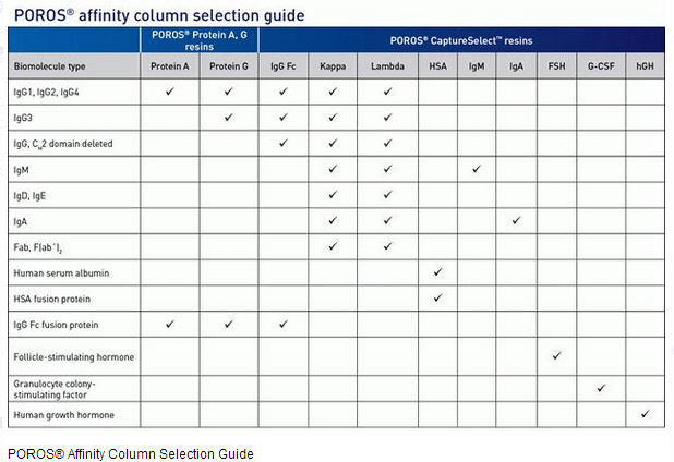 Applied Biosystems® POROS® Prepacked Protein A, Affinity Column. POROS® Protein A is based on an immobilized recombinant Protein A functional group designed for high throughput purification of antibodies. 20 micron particle size is used for high resolution and small scale preparative to semi-preparative separation of biomolecules.