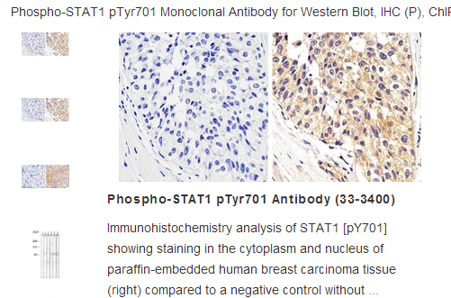 STAT1 (also known as signal transducers and activators of transcription) is a member of the STAT family of transcription factors. STAT proteins undergo phosphorylation in response to cytokines and growth factors and are translocated to the nucleus. STAT1 can be activated by interferon-alpha, interferon-gamma, EGF, PDGF and IL6. The protein is known to regulate several genes which are involved in cell growth, apoptosis, immune responses, and lipid metabolism. The STAT1 gene is located on chromosome 2.